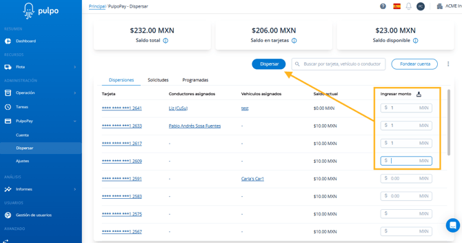 Solo puedes dispersar a tarjetas que estén activas y asignadas a un conductor o vehículo.