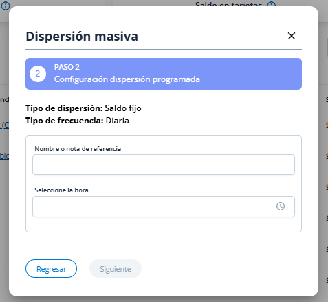 Confirmación del resumen general: tarjetas, montos, tipo de dispersión y frecuencia