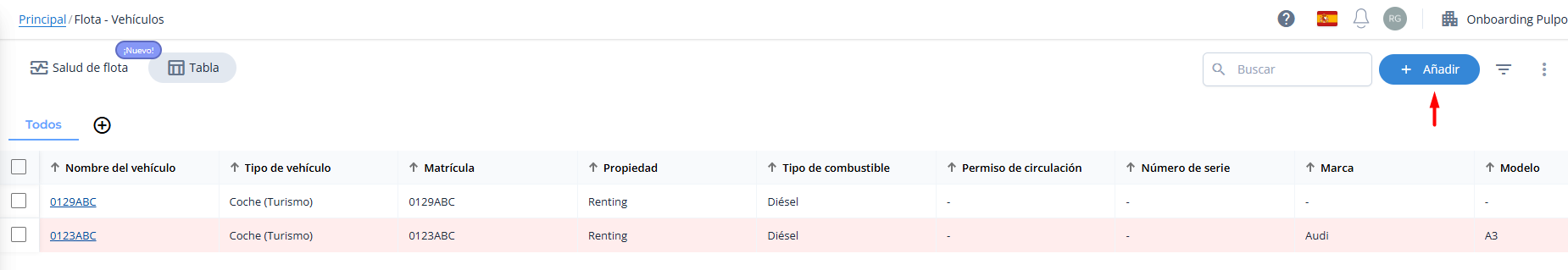 Haz clic en “Añadir” para crear un nuevo vehículo.
