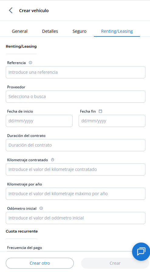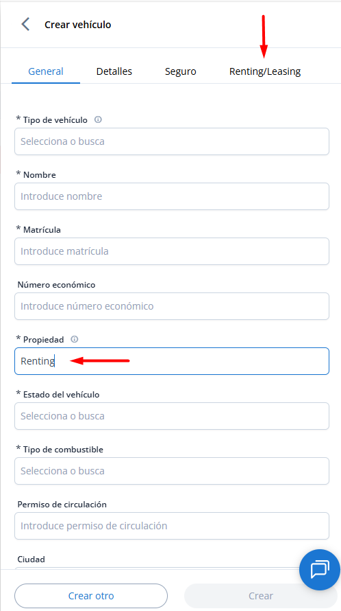 Una vez definida la propiedad del vehículo, accede a la pestaña Renting/Leasing desde la parte superior del formulario.