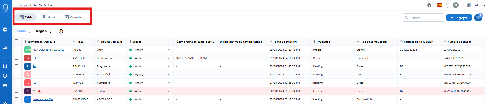 Para empezar, accede al panel lateral izquierdo y selecciona Flota > Vehículos. Este módulo consta de dos pantallas principales que te ofrecen diferentes vistas y funcionalidades para gestionar tus vehículos de manera eficiente.