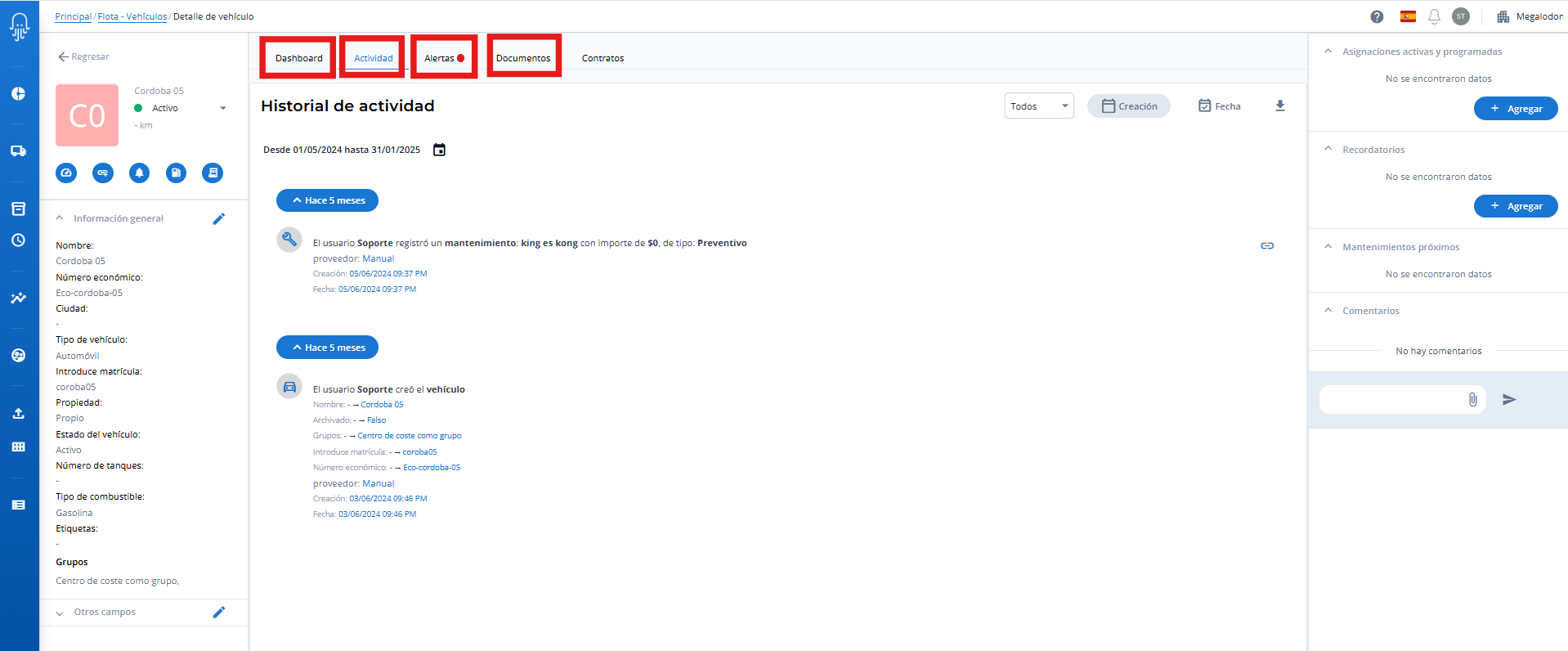 Asignaciones: Gestiona qué conductores o equipos tienen asignado el vehículo.