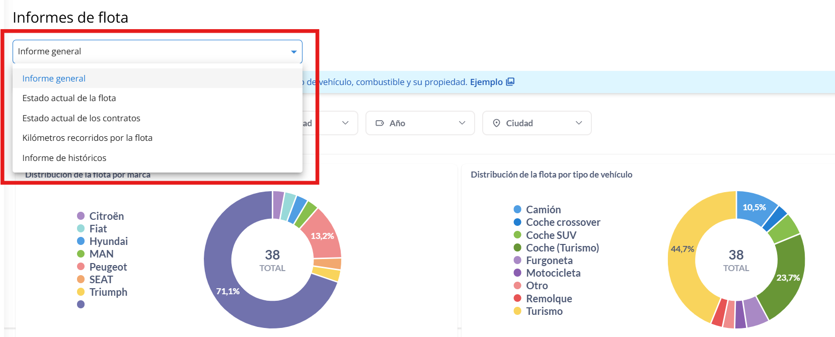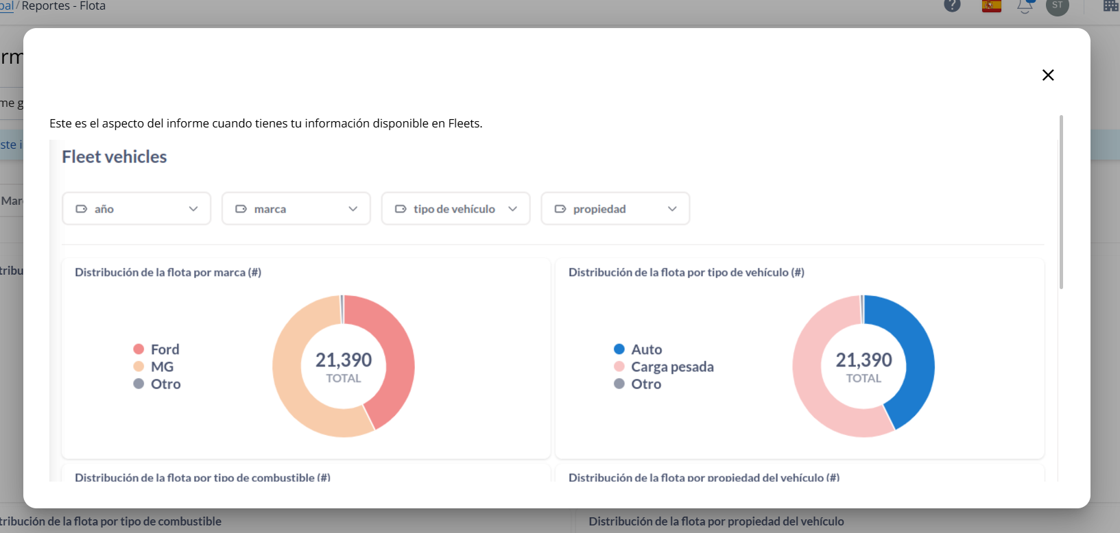 Flota: Analiza la distribución y disponibilidad de tus vehículos según marca, tipo, propiedad, combustible y más.